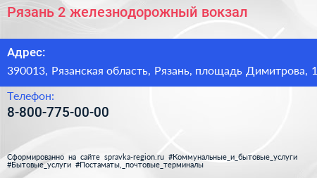 Рязань-2, железнодорожный вокзал по адресу 390013, Рязанская область, Рязань, площадь Димитрова, 1 в дальнейшем Организация, размещена в следующих категориях: