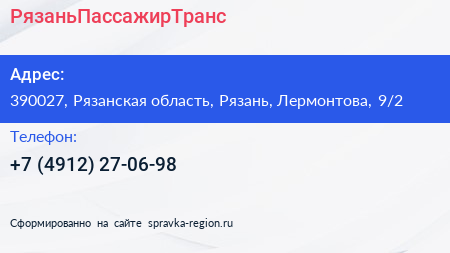 РязаньПассажирТранс по адресу 390027, Рязанская область, Рязань, Лермонтова, 9/2 в дальнейшем Организация, размещена в следующих категориях: