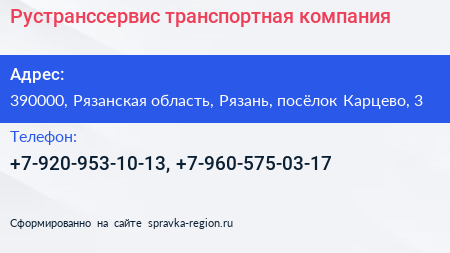 Рустранссервис, транспортная компания по адресу 390000, Рязанская область, Рязань, посёлок Карцево, 3 в дальнейшем Организация, размещена в следующих категориях: