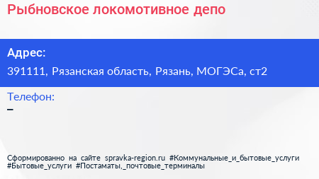 Рыбновское локомотивное депо по адресу 391111, Рязанская область, Рязань, МОГЭСа, ст2 в дальнейшем Организация, размещена в следующих категориях: