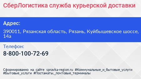 СберЛогистика, служба курьерской доставки по адресу 390011, Рязанская область, Рязань, Куйбышевское шоссе, 14а в дальнейшем Организация, размещена в следующих категориях: