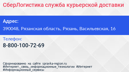 СберЛогистика, служба курьерской доставки по адресу 390048, Рязанская область, Рязань, Васильевская, 16 в дальнейшем Организация, размещена в следующих категориях:
