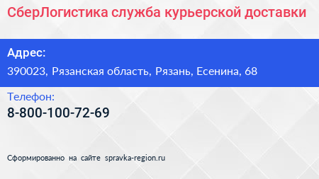 СберЛогистика, служба курьерской доставки по адресу 390023, Рязанская область, Рязань, Есенина, 68 в дальнейшем Организация, размещена в следующих категориях: