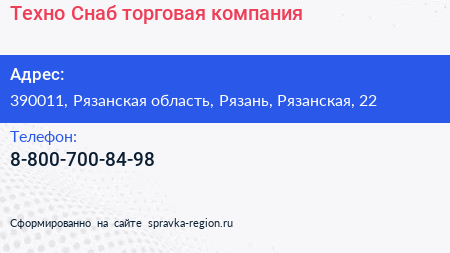Техно-Снаб, торговая компания по адресу 390011, Рязанская область, Рязань, Рязанская, 22 в дальнейшем Организация, размещена в следующих категориях: