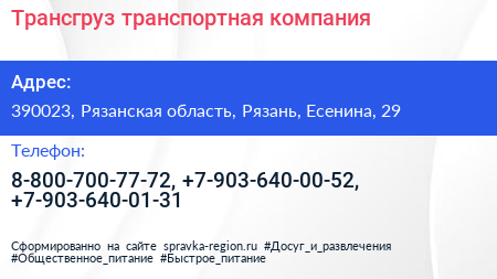 Трансгруз, транспортная компания по адресу 390023, Рязанская область, Рязань, Есенина, 29 в дальнейшем Организация, размещена в следующих категориях: