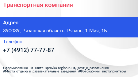 Транспортная компания по адресу 390039, Рязанская область, Рязань, 1 Мая, 1Б в дальнейшем Организация, размещена в следующих категориях: