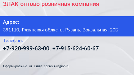 ЗЛАК, оптово-розничная компания по адресу 391110, Рязанская область, Рязань, Вокзальная, 20Б в дальнейшем Организация, размещена в следующих категориях: