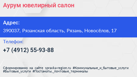 Аурум, ювелирный салон по адресу 390037, Рязанская область, Рязань, Новосёлов, 17 в дальнейшем Организация, размещена в следующих категориях:
