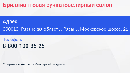 Бриллиантовая ручка, ювелирный салон по адресу 390013, Рязанская область, Рязань, Московское шоссе, 21 в дальнейшем Организация, размещена в следующих категориях:
