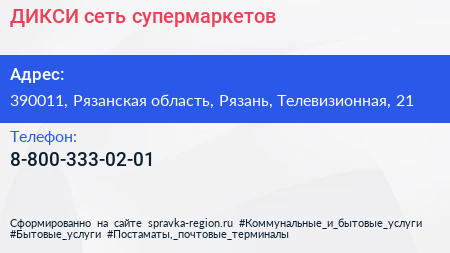 ДИКСИ, сеть супермаркетов по адресу 390011, Рязанская область, Рязань, Телевизионная, 21 в дальнейшем Организация, размещена в следующих категориях: