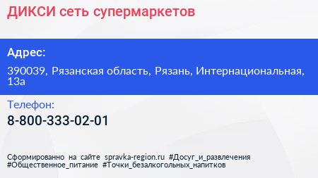 ДИКСИ, сеть супермаркетов по адресу 390039, Рязанская область, Рязань, Интернациональная, 13а в дальнейшем Организация, размещена в следующих категориях: