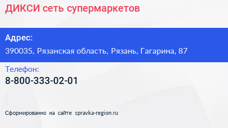 ДИКСИ, сеть супермаркетов по адресу 390035, Рязанская область, Рязань, Гагарина, 87 в дальнейшем Организация, размещена в следующих категориях: