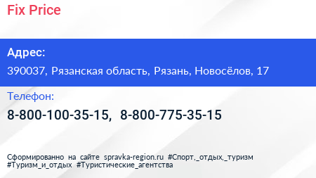 Fix Price по адресу 390037, Рязанская область, Рязань, Новосёлов, 17 в дальнейшем Организация, размещена в следующих категориях:
