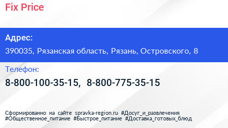 Fix Price по адресу 390035, Рязанская область, Рязань, Островского, 8 в дальнейшем Организация, размещена в следующих категориях: