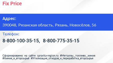Fix Price по адресу 390048, Рязанская область, Рязань, Новосёлов, 56 в дальнейшем Организация, размещена в следующих категориях: