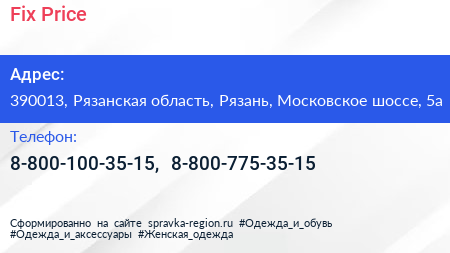 Fix Price по адресу 390013, Рязанская область, Рязань, Московское шоссе, 5а в дальнейшем Организация, размещена в следующих категориях: