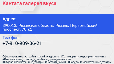 Кантата, галерея вкуса по адресу 390013, Рязанская область, Рязань, Первомайский проспект, 70 к1 в дальнейшем Организация, размещена в следующих категориях: