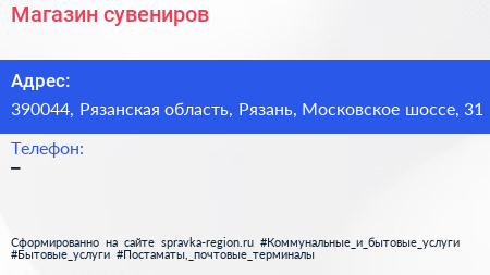 Магазин сувениров по адресу 390044, Рязанская область, Рязань, Московское шоссе, 31 в дальнейшем Организация, размещена в следующих категориях: