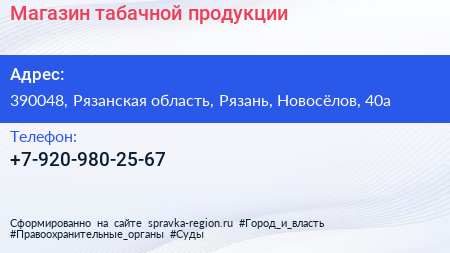 Магазин табачной продукции по адресу 390048, Рязанская область, Рязань, Новосёлов, 40а в дальнейшем Организация, размещена в следующих категориях: