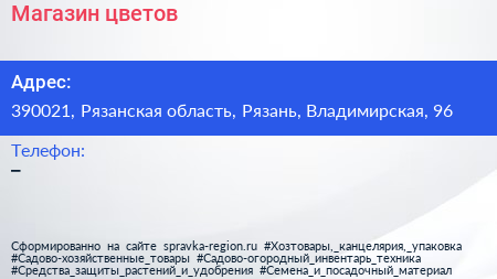 Магазин цветов по адресу 390021, Рязанская область, Рязань, Владимирская, 96 в дальнейшем Организация, размещена в следующих категориях: