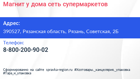 Магнит у дома, сеть супермаркетов по адресу 390527, Рязанская область, Рязань, Советская, 2Б в дальнейшем Организация, размещена в следующих категориях: