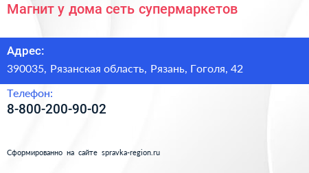 Магнит у дома, сеть супермаркетов по адресу 390035, Рязанская область, Рязань, Гоголя, 42 в дальнейшем Организация, размещена в следующих категориях: