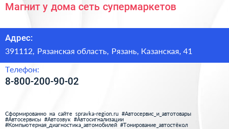 Магнит у дома, сеть супермаркетов по адресу 391112, Рязанская область, Рязань, Казанская, 41 в дальнейшем Организация, размещена в следующих категориях: