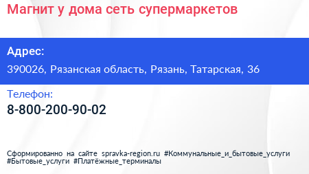 Магнит у дома, сеть супермаркетов по адресу 390026, Рязанская область, Рязань, Татарская, 36 в дальнейшем Организация, размещена в следующих категориях: