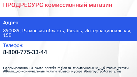 ПРОДРЕСУРС, комиссионный магазин по адресу 390039, Рязанская область, Рязань, Интернациональная, 15Б в дальнейшем Организация, размещена в следующих категориях: