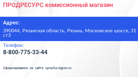 ПРОДРЕСУРС, комиссионный магазин по адресу 390044, Рязанская область, Рязань, Московское шоссе, 31 ст3 в дальнейшем Организация, размещена в следующих категориях: