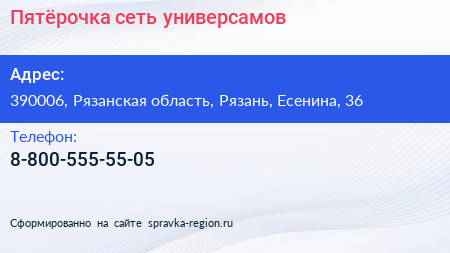 Пятёрочка, сеть универсамов по адресу 390006, Рязанская область, Рязань, Есенина, 36 в дальнейшем Организация, размещена в следующих категориях: