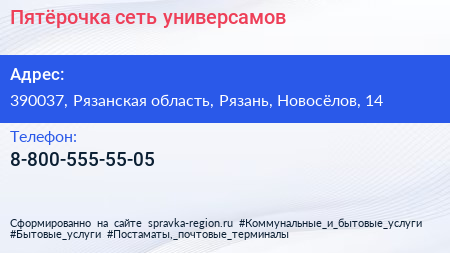 Пятёрочка, сеть универсамов по адресу 390037, Рязанская область, Рязань, Новосёлов, 14 в дальнейшем Организация, размещена в следующих категориях: