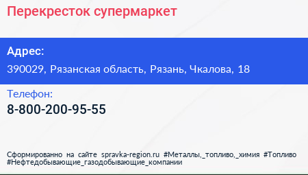 Перекресток, супермаркет по адресу 390029, Рязанская область, Рязань, Чкалова, 18 в дальнейшем Организация, размещена в следующих категориях: