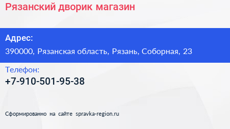 Рязанский дворик, магазин по адресу 390000, Рязанская область, Рязань, Соборная, 23 в дальнейшем Организация, размещена в следующих категориях: