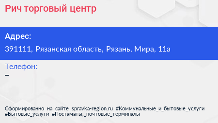 Рич, торговый центр по адресу 391111, Рязанская область, Рязань, Мира, 11а в дальнейшем Организация, размещена в следующих категориях: