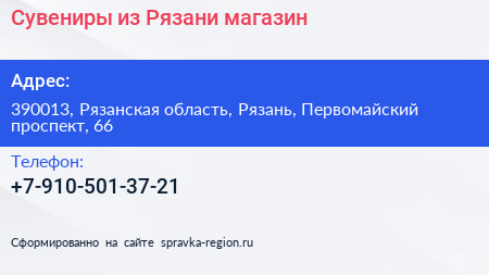 Сувениры из Рязани, магазин по адресу 390013, Рязанская область, Рязань, Первомайский проспект, 66 в дальнейшем Организация, размещена в следующих категориях: