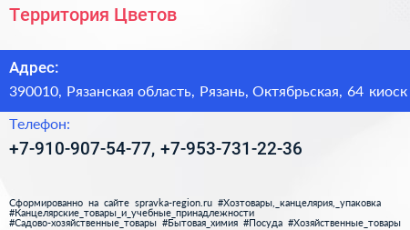 Территория Цветов по адресу 390010, Рязанская область, Рязань, Октябрьская, 64 киоск в дальнейшем Организация, размещена в следующих категориях: