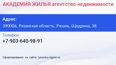 АКАДЕМИЯ ЖИЛЬЯ, агентство недвижимости по адресу 390006, Рязанская область, Рязань, Щедрина, 38 в дальнейшем Организация, размещена в следующих категориях: