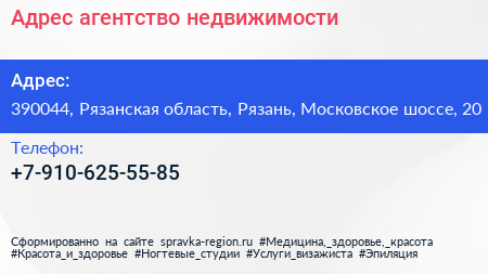 Адрес, агентство недвижимости по адресу 390044, Рязанская область, Рязань, Московское шоссе, 20 в дальнейшем Организация, размещена в следующих категориях: