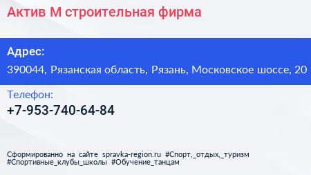Актив-М, строительная фирма по адресу 390044, Рязанская область, Рязань, Московское шоссе, 20 в дальнейшем Организация, размещена в следующих категориях: