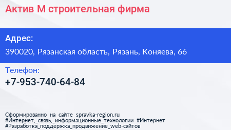 Актив-М, строительная фирма по адресу 390020, Рязанская область, Рязань, Коняева, 66 в дальнейшем Организация, размещена в следующих категориях: