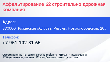 Асфальтирование 62, строительно дорожная компания по адресу 390000, Рязанская область, Рязань, Новослободская, 20а в дальнейшем Организация, размещена в следующих категориях: