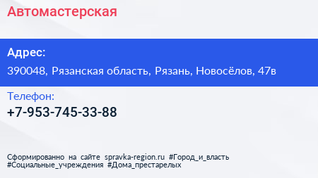 Автомастерская по адресу 390048, Рязанская область, Рязань, Новосёлов, 47в в дальнейшем Организация, размещена в следующих категориях: