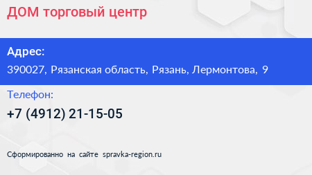 ДОМ, торговый центр по адресу 390027, Рязанская область, Рязань, Лермонтова, 9 в дальнейшем Организация, размещена в следующих категориях: