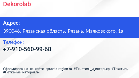 Dekorolab по адресу 390046, Рязанская область, Рязань, Маяковского, 1а в дальнейшем Организация, размещена в следующих категориях: