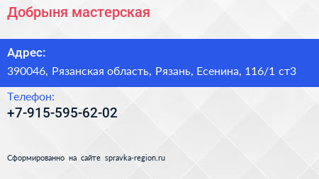 Добрыня, мастерская по адресу 390046, Рязанская область, Рязань, Есенина, 116/1 ст3 в дальнейшем Организация, размещена в следующих категориях: