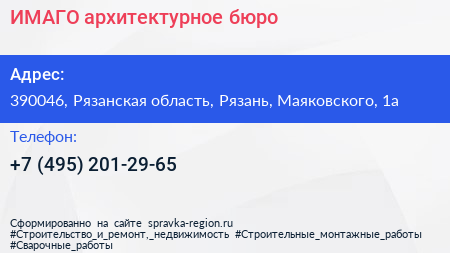 ИМАГО, архитектурное бюро по адресу 390046, Рязанская область, Рязань, Маяковского, 1а в дальнейшем Организация, размещена в следующих категориях: