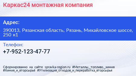 Каркас24, монтажная компания по адресу 390013, Рязанская область, Рязань, Михайловское шоссе, 250 к1 в дальнейшем Организация, размещена в следующих категориях:
