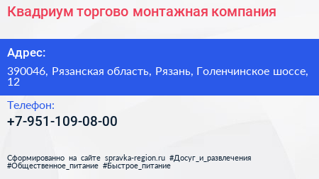 Квадриум, торгово-монтажная компания по адресу 390046, Рязанская область, Рязань, Голенчинское шоссе, 12 в дальнейшем Организация, размещена в следующих категориях: