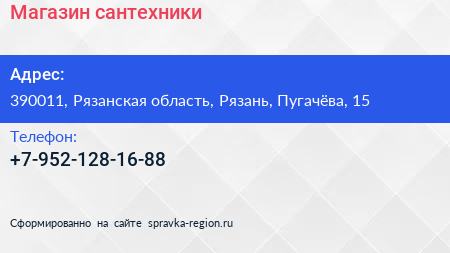 Магазин сантехники по адресу 390011, Рязанская область, Рязань, Пугачёва, 15 в дальнейшем Организация, размещена в следующих категориях: